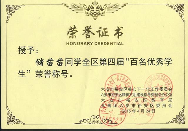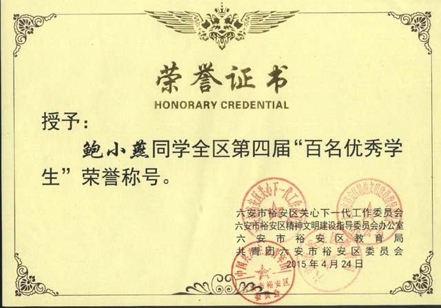 六安市新安中学荣兴诚、鲍小燕等五位同学获得裕安区第四届“十佳”少年、百名优秀学生荣誉称号