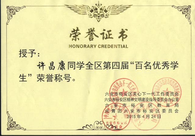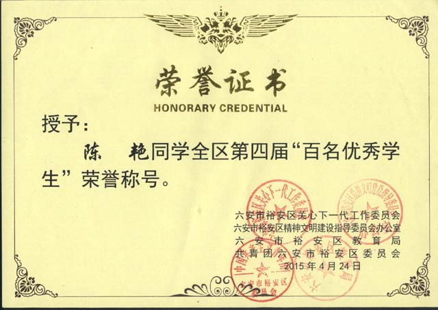 2015年5月9日,六安市裕安区召开第四届“十佳”少年、百名优秀学生表彰大会,市、区关工委,区委组织部、区教育局、区共青团等相关部门负责人出席表彰大会。