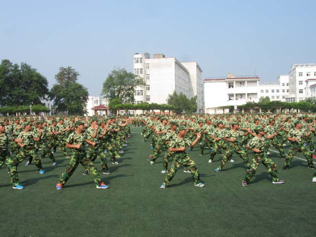 承担新安中学2015级高一新生军训任务的是安徽警官学院,22名教官分早晨、上午、下午和晚上四个时段对学生进行军事训练、国防教育、内务整理、教唱军歌等,整个军训历时五天,按计划平安、顺利、圆满完成。