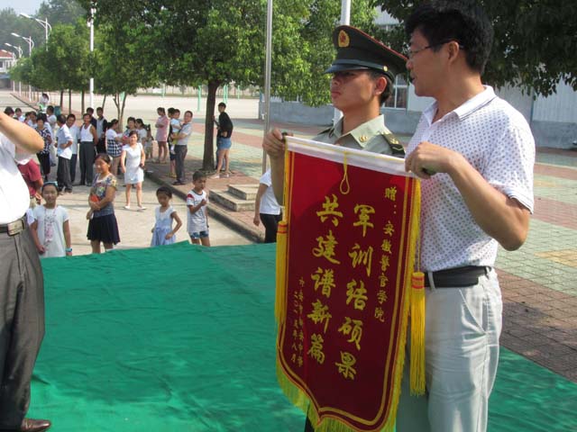 李校长宣读了在此次军训活动中表现突出的1个优秀班集体、20名优秀学员名单,学校领导分别给优秀班集体、优秀学员颁发了奖章和荣誉证书。各班级派出的学生代表向教官们敬献了鲜花,鲍俊副校长代表学校向安徽警官学院赠送了锦旗。