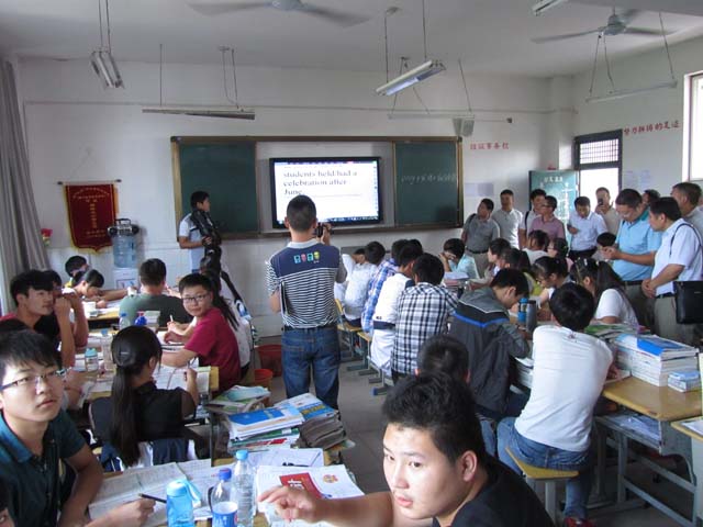 在寿县安丰中学,考察团听取了陈超校长关于近几年在推进安徽省“推进教育信息化建设”试点工作和“基于微课的翻转课堂”项目研究工作的进展情况和取得的业绩介绍,参观了安丰中学社团文化建设情况、班班通教室和多功能录播教室,现场观摩了高三英语教师在班班通教室利用多媒体、触摸屏幕教学情况。