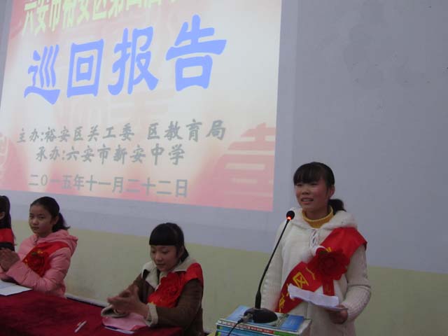 2015年11月22日上午,六安市裕安区第四届“十佳少年”先进事迹巡回演讲报告会在新安中学报告厅隆重举行,新安中学高一年级300名学生代表参加了报告会。出席报告会的有:裕安区关工委常务副主任胡文运、副主任李运生,区教育局党委书记、副局长鲍传满,区教育局关工委负责人刘天明、张家鼐,团区委、区文明办有关领导,新安、顺河、单王三乡镇的关工委主任,裕安区十佳少年巡回报告团生活指导老师及新安中学校长朱思平、副校长王家宗、关工委主任曹庆和等,报告会由新安中学语文教师田俊同志主持,王家宗同志代表学校致欢迎词。