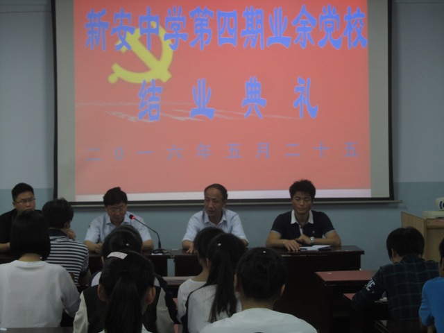 2016年5月25日晚,六安市新安中学第四期学生业余党校结业典礼仪式在科学馆二楼多功能室举行。第四期全体学生业余党校学员参加,校党总支部书记、副校长王家宗,副书记许大俊,团委书记姚俊,业余党校特聘教师汤玉友出席,姚俊主持。