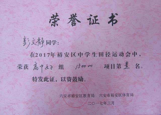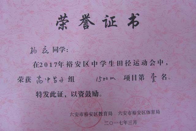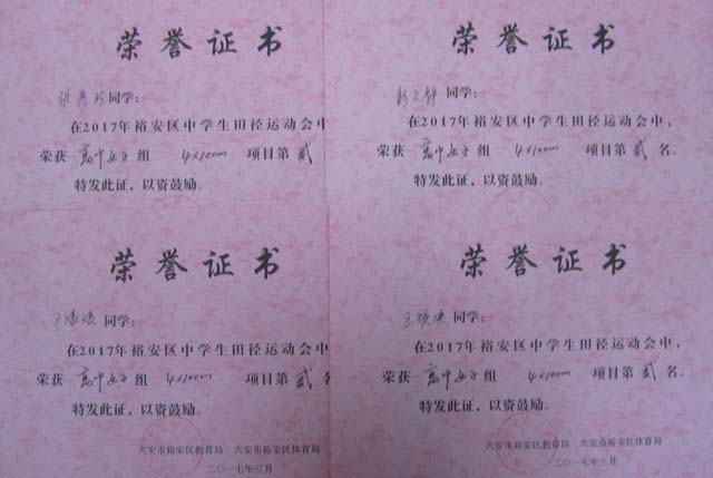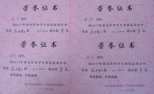 程超、杨磊、张建民、彭文静(女)四名同学将代表裕安区参加六安市2017年中学生运动会比赛。