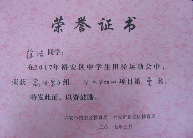 在刚刚结束的六安市裕安区2017年中学生田径运动会比赛中,新安中学代表队努力拼搏,荣获高中组团体比赛第二名。比赛中,参赛运动员不畏强手,团结协作,他们以自己的行动展现了奋发向上的拼搏精神和良好风貌,其中运动员程超、杨磊、葛小虎、林桐夺得男子4*100米接力赛冠军;程超、杨磊、葛小虎、徐浩夺得男子4*400米接力赛冠军;彭文静、张秀玲、王媛媛、王焕焕夺得女子4*100米接力赛亚军;杨磊夺得男子1500米冠军;彭文静夺得女子1500米冠军;张建民夺得男子跳远冠军;程超夺得男子400米冠军。