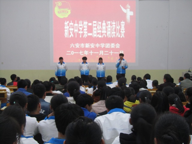 六安市新安中学举行第二届经典诗文诵读比赛来源:新安中学团委会 2017年11月21日晚,由六安市新安中学团委会举办、语文教研组协办的第二届经典诗文诵读活动比赛在学校科学馆报告厅举行。举办此次活动的目的是为了贯彻落实党的十九大精神,落实立德树人根本任务,进一步加强新形势下中华优秀传统文化教育,大力弘扬和培育中华民...