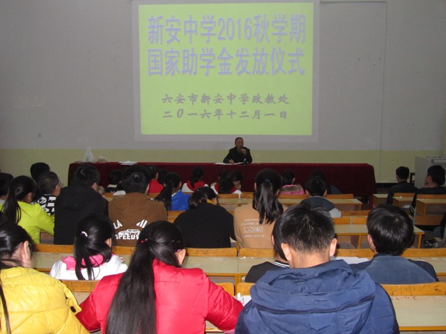 六安市新安中学发放2016年秋季学生“国家助学金”来源:新安中学政教处 根据国家和各级教育主管部门有关“国家助学”金文件精神,六安市新安中学于2016年12月1日下午在科学馆报告厅举行2016年秋季“国家助学金”发放仪式。新安中学各班班长或受助学生代表参加了发放仪式,政教处副主任李图广、储江出席,李图广主持。  李图广同志在...