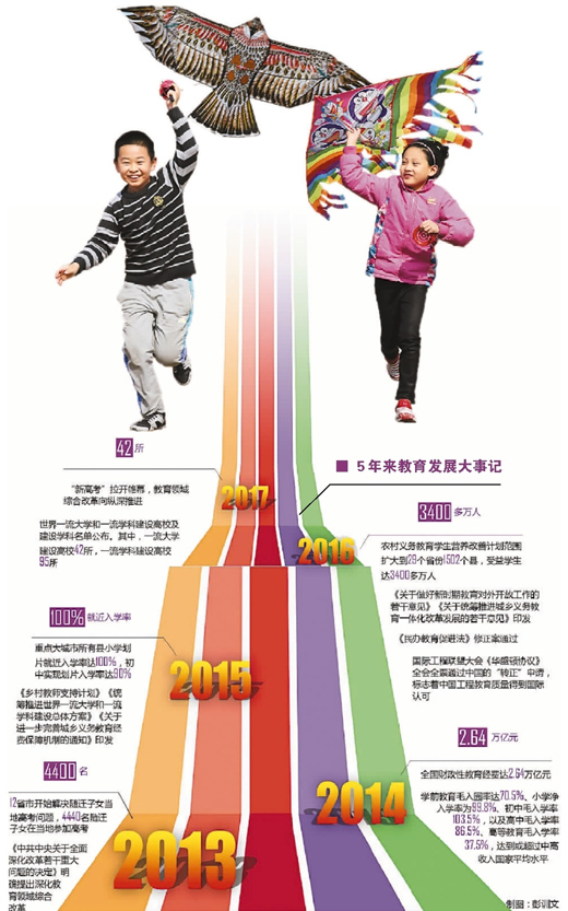 四川省三台县新生镇小学学生吃午餐。 蒲滔摄(人民视觉) 9月24日,《关于深化教育体制机制改革的意见》对外发布,提出到2020年基本建立教育基础性制度体系; 9月21日,中国“双一流”(世界一流大学和一流学科)建设高校及建设学科名单公布,为增强国家核心竞争力奠定了长远发展基础; 9月13日,深圳北理莫斯科大学正式开学,标志着中外教育领域合作翻开崭新一页; …… 5年来,中国教育优先发展,教育质量不断提升,教育公平受益面不断扩大,中国正努力用更好的教育回应人民的热切期盼。 质量提升 9月5日,北京八一学校的荣臻礼堂里,15名学生正围在10米长的绘画桌旁作画。广场上摆放着老挝、缅甸两国小学生的200多幅绘画作品。这是“一带一路·民心相通”学生手拉手活动。加强国际交流成为八一学校提升办学质量的重要环节。 1年前,习近平总书记来到八一学校视察。他说,我国正处于历史上发展最好的时期,但要实现“两个一百年”奋斗目标、实现中华民族伟大复兴的中国梦,必须更加重视教育,努力培养出更多更好能够满足党、国家、人民、时代需要的人才。 教育现代化的核心是提高人才培养质量。5年来,通过拓宽教师来源、强化教学环节,中国教育教学质量不断提高。 西北政法大学的讲台上,经常出现陕西省西安市雁塔区检察院副检察长王秦龙的身影。3年多来,他用近300个案件做教材,为同学们带来了一堂堂别开生面的实务课程。 5年来,教育改革全面深化,一系列指导措施和规划意见相继提出。从教师队伍建设到考试制度,从职业教育到创新创业教育,从中小学教学改革到地方高等本科院校转型……改革任务落在了每一个实处。 高考改革成为教育改革的重要抓手。目前,中国31个省(区、市)均已形成改革实施方案,破除“一考定终身”;文理不分科已成趋势;语文、数学、外语3个科目成绩加高中学业水平考试3个科目成绩的“3+3”形式成为高考新模式。 2014年9月,习近平来到北京师范大学看望教师学生时说,今天的学生就是未来实现中华民族伟大复兴中国梦的主力军,广大教师就是打造这支中华民族“梦之队”的筑梦人。 5年来,一支业务精湛、充满活力的教师队伍正在形成。 9月24日,《关于深化教育体制机制改革的意见》对外发布,强调要切实提高教师待遇,确保教师平均工资水平不低于或高于当地公务员平均工资水平。 乡村教师队伍建设一直是教师队伍建设中的短板。2015年,中国发布《乡村教师支持计划(2015—2020年)》,提出逐步形成“越往基层、越是艰苦,地位待遇越高”的激励机制。 “培训机会多了,农村教师补贴兑现了,日子越来越舒心了。”宁夏回族自治区石嘴山市惠农区教师秦鹏表示,改革为乡村教师带来了福利。 春天的燕园,湖光塔影,绿树婆娑。2014年5月4日,在这个属于青春的节日里,习近平深切地对青年们说,人生的扣子从一开始就要扣好。 5年来,德育被放在了更加重要的位置。《青少年法治教育大纲》印发,法治教育纳入国民教育体系;教育部统一组织新编的义务教育教材《道德与法治》开始启用;更多中华优秀传统文化走进课堂;27所中央直接管理高校专门成立党委教师工作部,统筹推进高校思想政治工作。 均衡发展 教育公平是社会公平的重要基础。习近平强调,要不断促进教育发展成果更多更公平惠及全体人民,以教育公平促进社会公平正义。 6月7日早上,风轻云淡,阳光明媚。甘肃省康县残疾考生巨晓走进了政府专门为他设置的高考单人考场,“从那一刻起,我迎接了生命的新曙光。”一个多月后,巨晓接到了兰州交通大学的录取通知书。 2017年4月,教育部、中国残联印发《残疾人参加普通高等学校招生全国统一考试管理规定》,像巨晓这样的残疾人,有更多的机会走进高校校园。 孩子的教育,关系到祖国的未来;贫困地区孩子的教育,关系到全面建成小康社会的实现。习近平指出:到2020年全面建成小康社会,最艰巨的任务在贫困地区,我们必须补上这个短板。扶贫必扶智。让贫困地区的孩子们接受良好教育,是扶贫开发的重要任务,也是阻断贫困代际传递的重要途径。 曾经,地处太行山脉的河北省赞皇县北水峪的孩子们,最期待的是上学不再翻山越岭。走读之苦让当地辍学现象严重。 后来,河北省石家庄市推行山区教育扶贫工程,新建赞皇二中,把深山5个乡镇4所中学近3000名中学生集中起来寄宿读书。 从北水峪来到赞皇二中就读的时跃南觉得自己很幸运。几年前,姐姐要走十几里山路才能来到学校,而如今,他不必如此辛苦。 这5年,国家财政性教育经费使用始终坚持“保基本、补短板、促公平、提质量”,坚持向农村地区、边远贫困地区和民族地区倾斜。截至2016年底,中国集中连片特困地区708个县级单位中,有684个已实施乡村教师生活补助政策,覆盖率达97%;“免费师范生”每年吸引3.4万名高校毕业生直接到农村中小学任教;31万名“特岗教师”覆盖中西部3万多所农村学校;640多万中西部农村教师接受“国培计划”培训。 “各个学校、各个班级之间的师资配比都很均衡,所有的孩子都一视同仁,女儿也在家门口上了心仪的小学。孩子压力小了,家长压力也小了。”安徽省铜陵市的家长尹明怡笑了。 据统计,中国19个副省级以上大城市公办中小学学生就近入学比例均逾九成,“择校热”逐步降温,义务教育均衡发展满意度明显提升